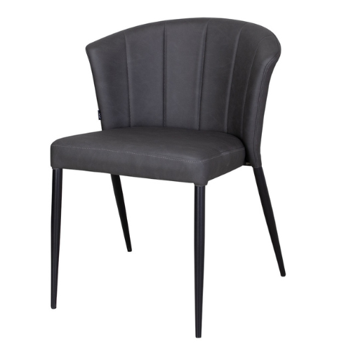 Her er en robust stol fra House of Sander. Selve stolen er udført i grå kunstlæder og stel i sort pulverlakeret metal. Der er synlige og dekorative syninger i ryglænet der giver stolen et elegant look og "bryder" det rå look. Stolen kan stables og er derfor ideel både til privat hvor pladsen er trang eller til restauranter og cafeer.