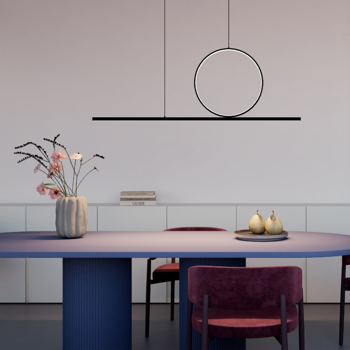Du kender den klassiske langbordspendel der findes i mange designs og materialer, men her har designet fået et tvist. Et "ringlight" balancere på pendel og dette kan tilmed roterer 360º.