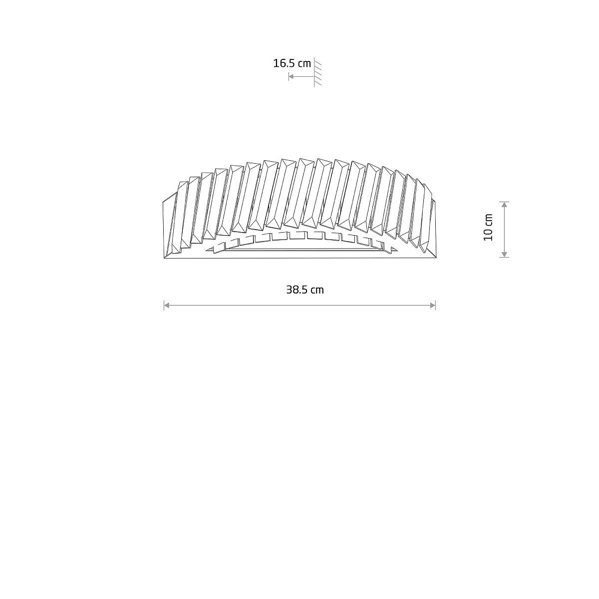 Mål: 38,5 cm bred, 10 cm høj. Fra væg til yderst på lampe er 16,5 cm.